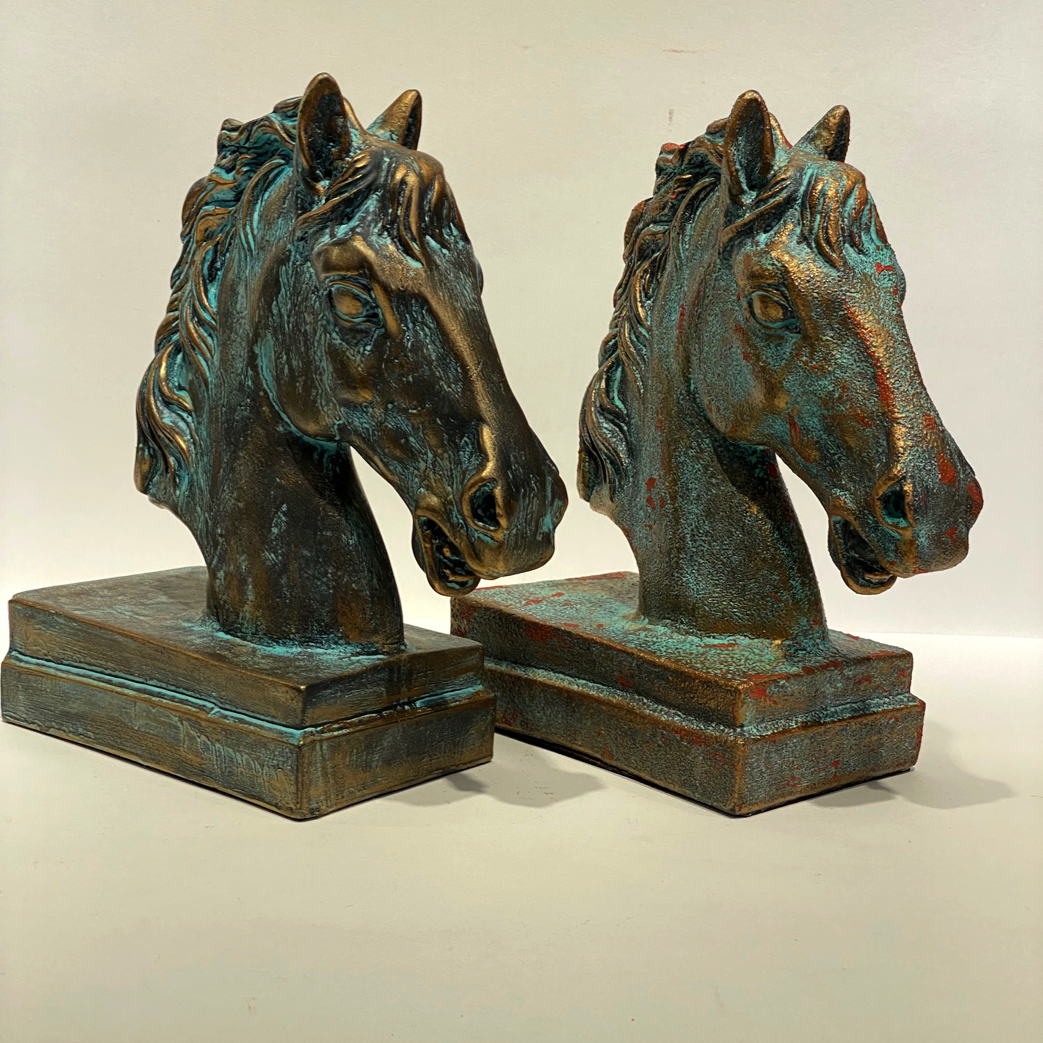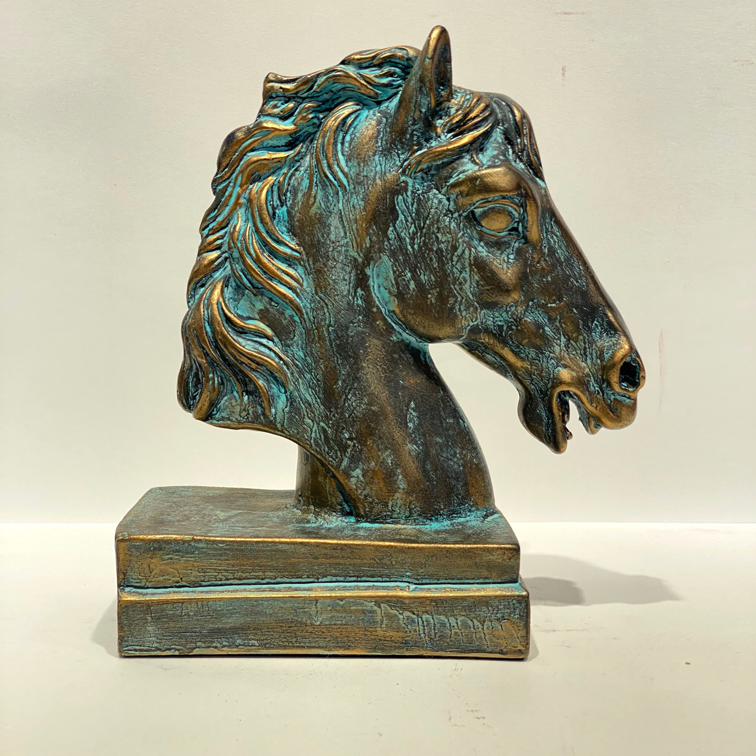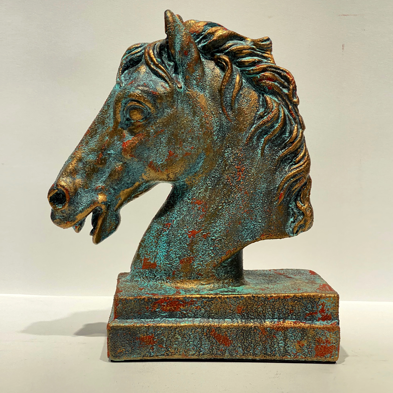 Статуэтка ручной работы Голова коня. Окрашено в авторской технике меловыми красками, патинами, декорировано воском. Выглядит как состаренное металлическое изделие, хотя сама фигурка сделана из гипса. Такая статуэтка будет великолепно смотреться на каминной полке, на столе начальника и даже выполнять роль пресс папье.