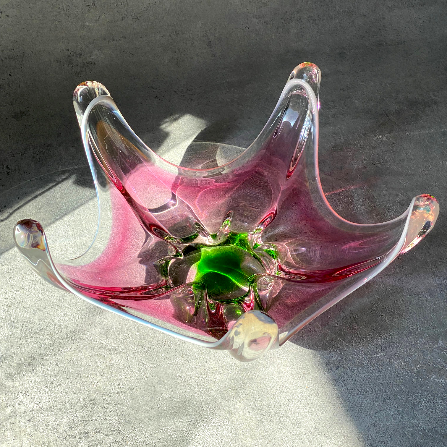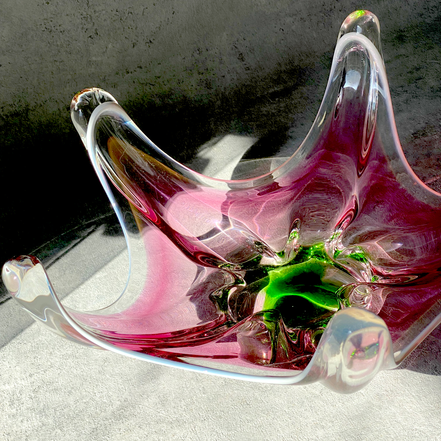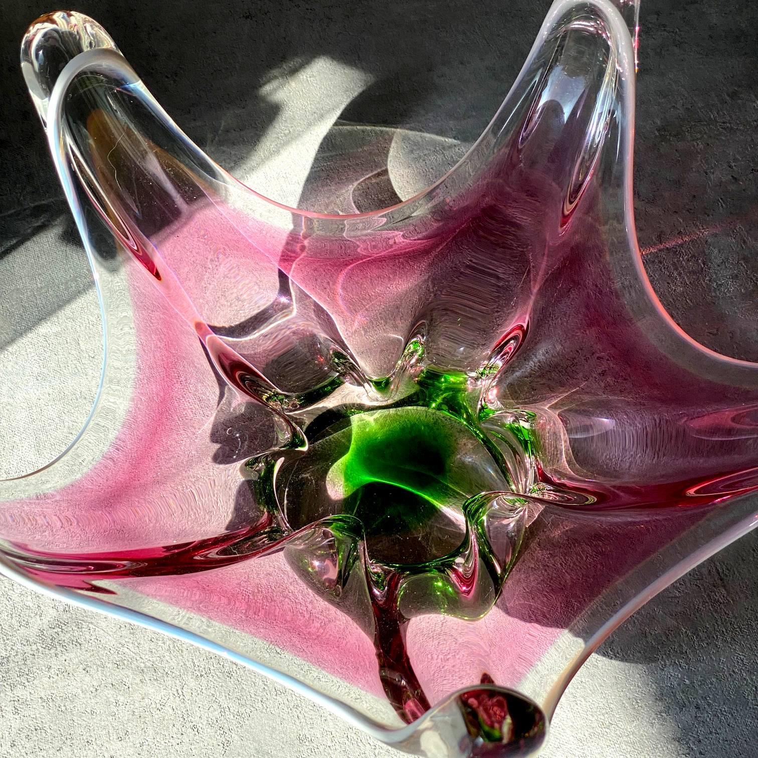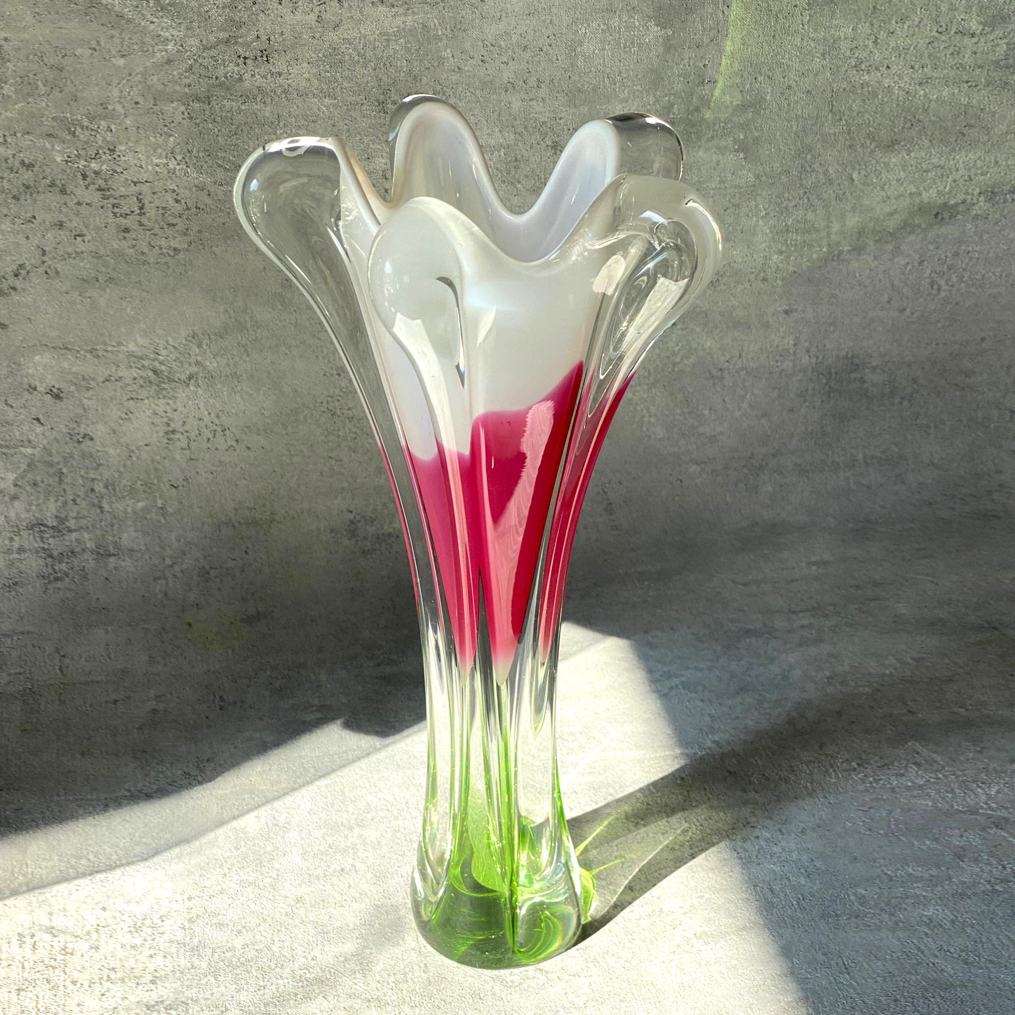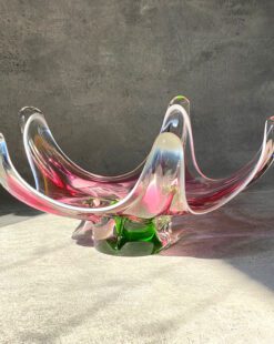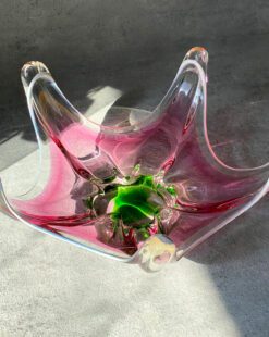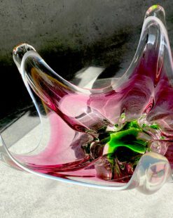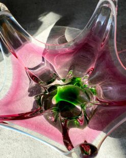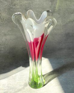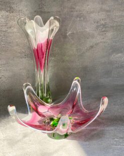 Роскошная, великолепная, необыкновенная ваза в ярких, насыщенных тонах. Эта ваза изготовлена вручную в 60-70х годах прошлого века в Чехословакии. Автор Йозеф Господка, изготовлено для Glassworks (Богемия), которая известна уникальностью своих изделий. Нежные и одновременно яркие тона прозрачного розового и зелёного, молочная полоска сульфидного стекла, перетекая друг в друга создают эффект свечения и производят неизгладимое впечатление, напоминая удивительный, волшебный цветок или морскую звезду. Ваза Медуза Pink green изготовлена в гутной технике (каждое изделие изготавливается мастером вручную из расплавленного стекла, так что сделать два одинаковых изделия просто не возможно). Такая ваза будет действительно VIP подарком для самого привередливого человека, ценящего уникальность и стиль. И, конечно, ваза Медуза Pink green — находка для интерьера. Это именно та «изюминка», которая сделает атмосферу в вашем доме. В наличии вазы этой серии другой формы.